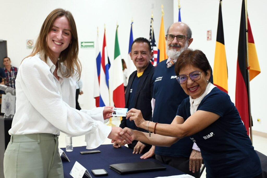 En esa ceremonia de bienvenida hizo entrega simbólica de la credencial de estudiante a una alumna de intercambio, para acreditarla como integrante de la comunidad universitaria de la BUAP.